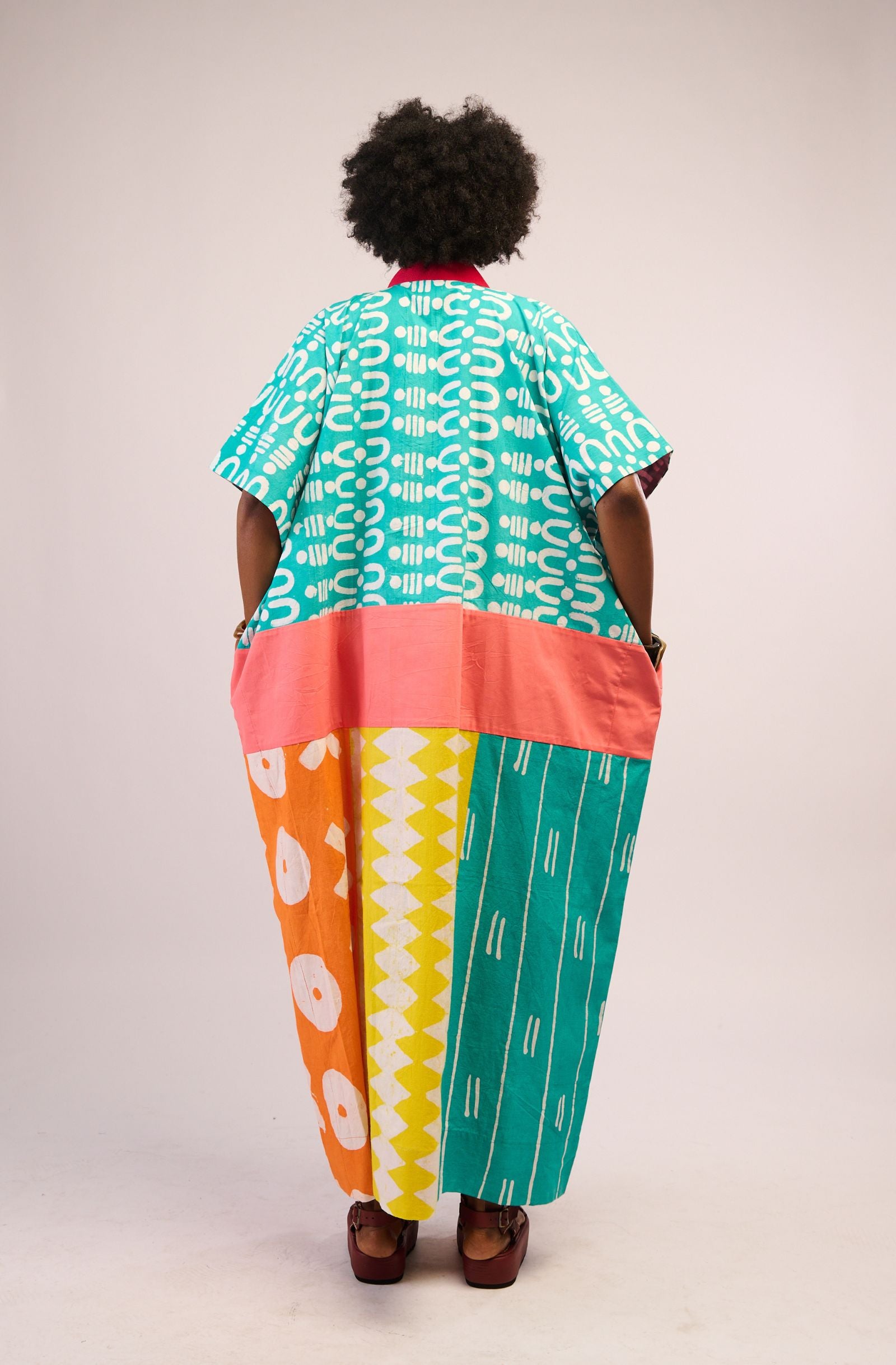 Our signature Agbada in bright multicolor with hand-woven aso oke in a contrasting color. This versatile yet sophisticated loungewear in this color and bold print is your new wardrobe staple.