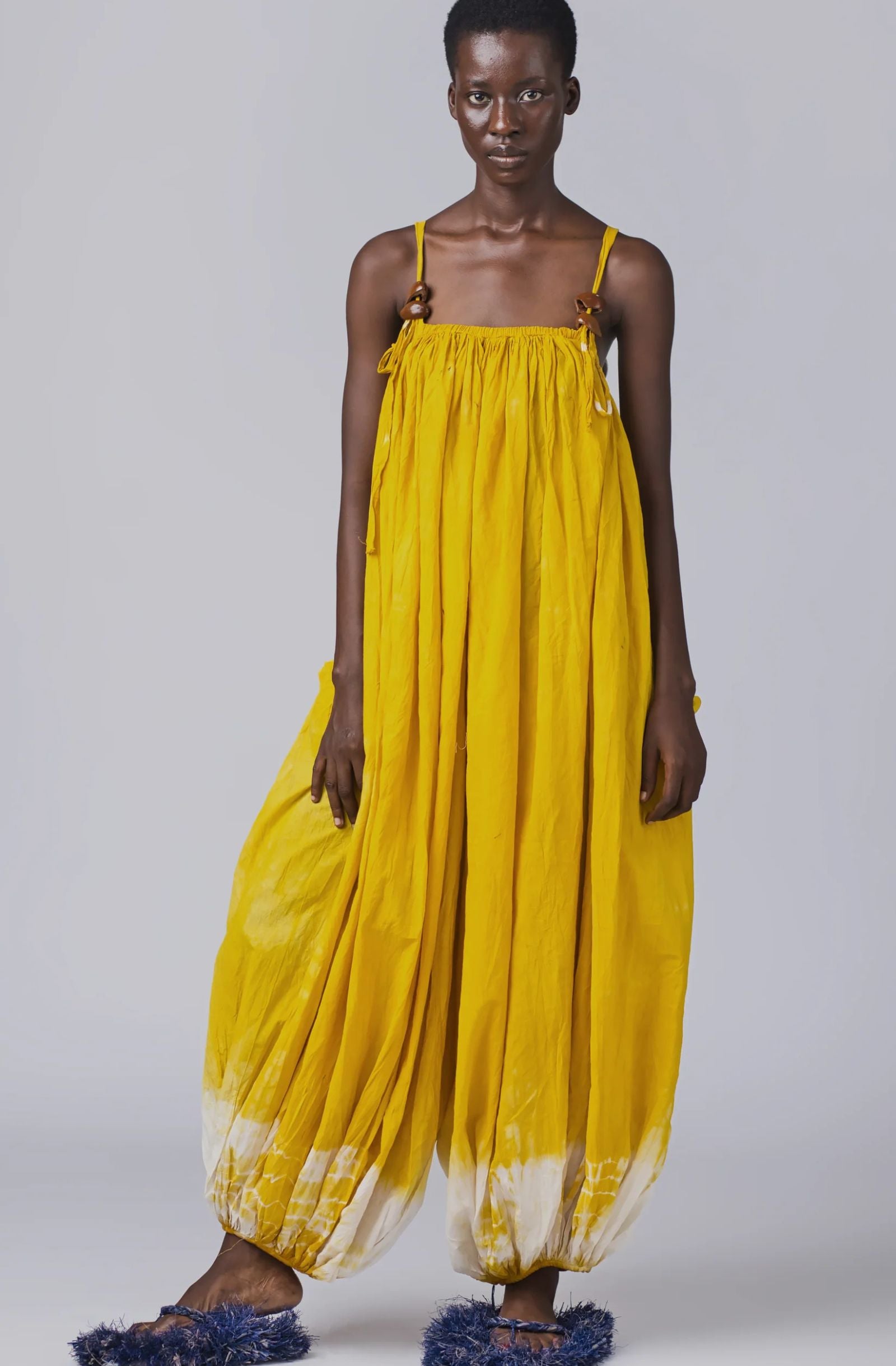 Shop our stunning sleeveless bubble jumpsuit featuring a vibrant tie and dye print detail at the bottom hem and delicate uyot seed accents. Perfect for formal events, parties, or making a statement at any occasion.