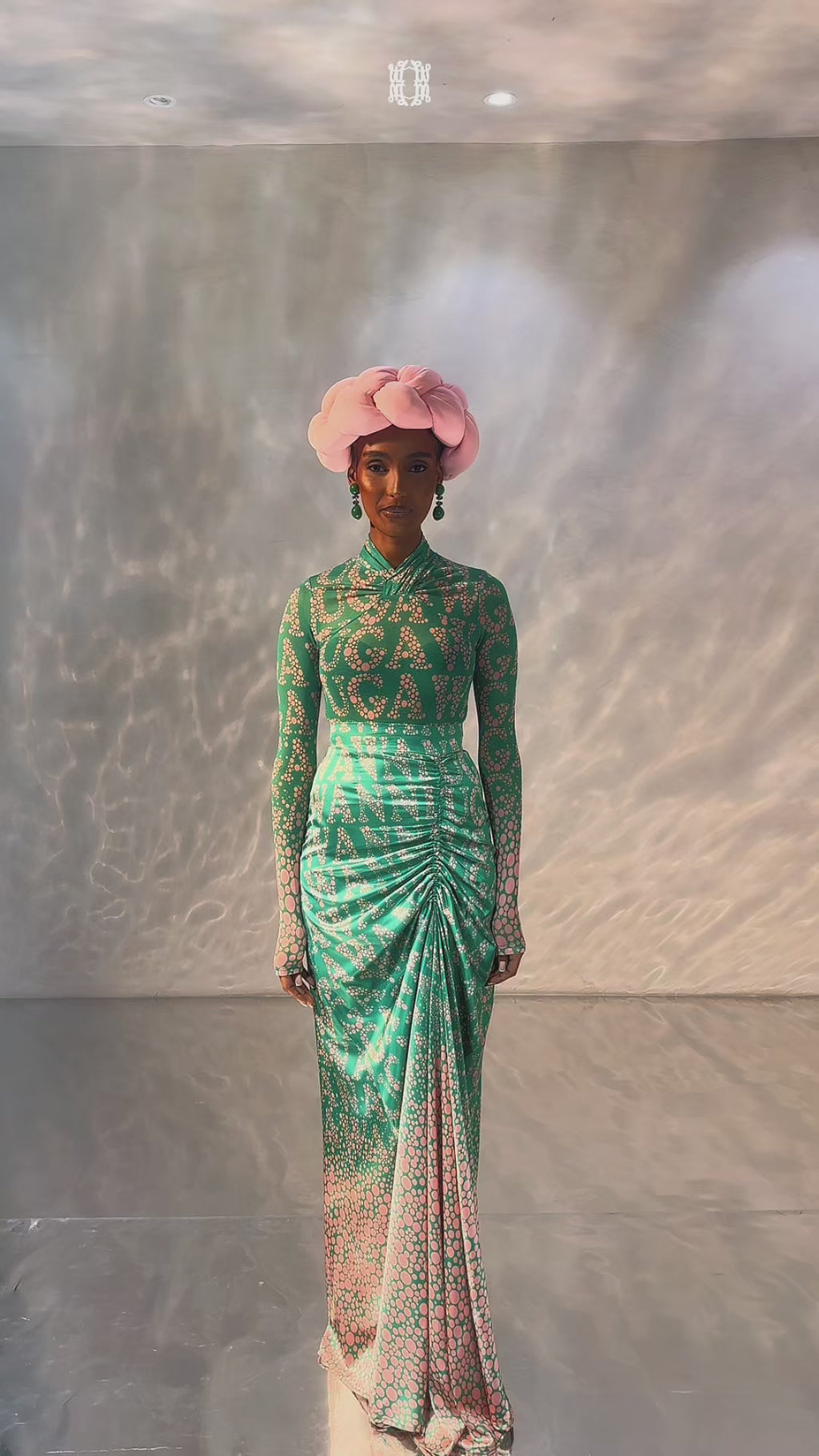 Cross detail neck bodysuit paired with high waisted silk drawstring skirt.